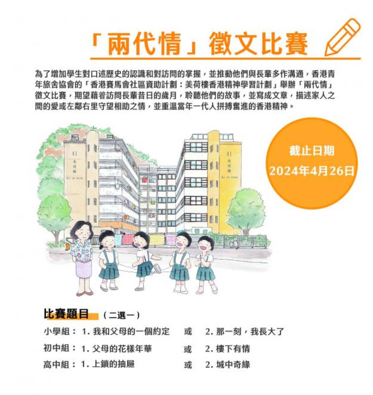為了增加學生對口述歷史的認識和對訪問的掌握,並推動他們與長輩多作溝通,香港青年旅舍協會的「香港賽馬會社區資助計劃:美荷樓香港精神學習計劃」舉辦「兩代情」徵文比賽,期望藉著訪問長輩昔日的屋邨歲月或其他居所生活情況,聆聽他們的故事,並寫成文章,描述家人之間的愛或左鄰右里守望相助之情,並重溫當年一代人拼搏奮進的香港精神。