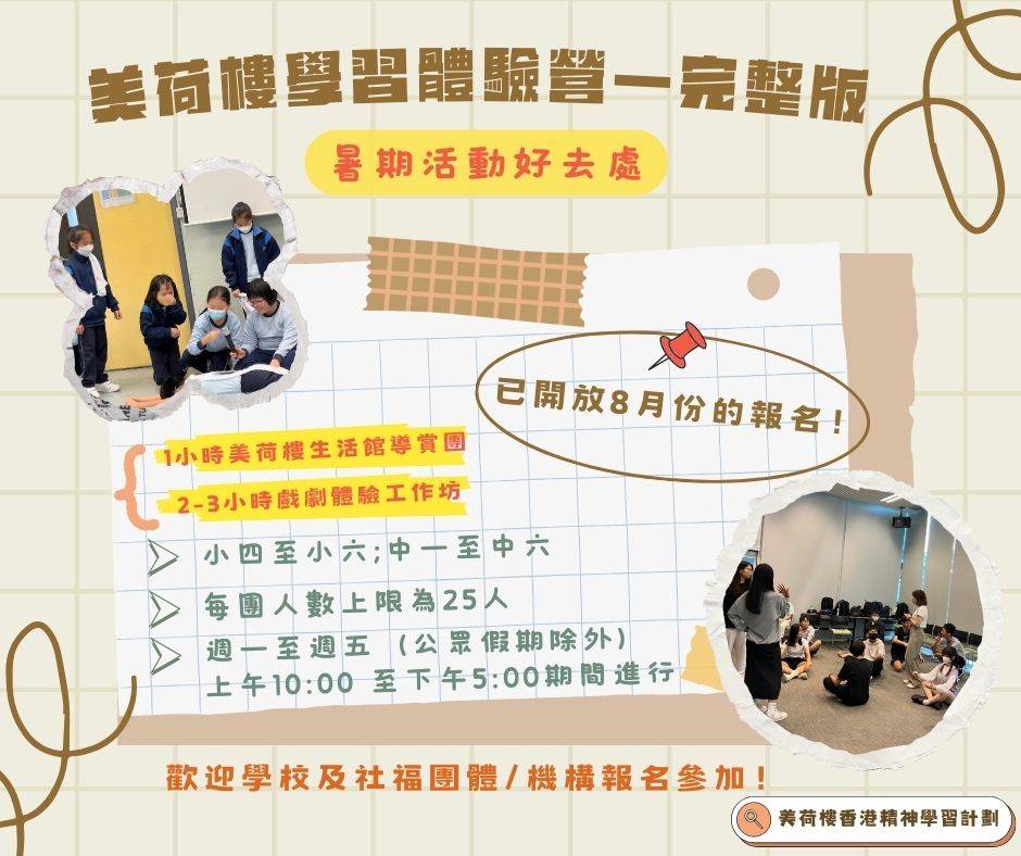 由於美荷樓生活館開放予公眾及團體參觀,遲到會對其他參觀者造成不便,敬請學校於活動開始前 15 分鐘到達。